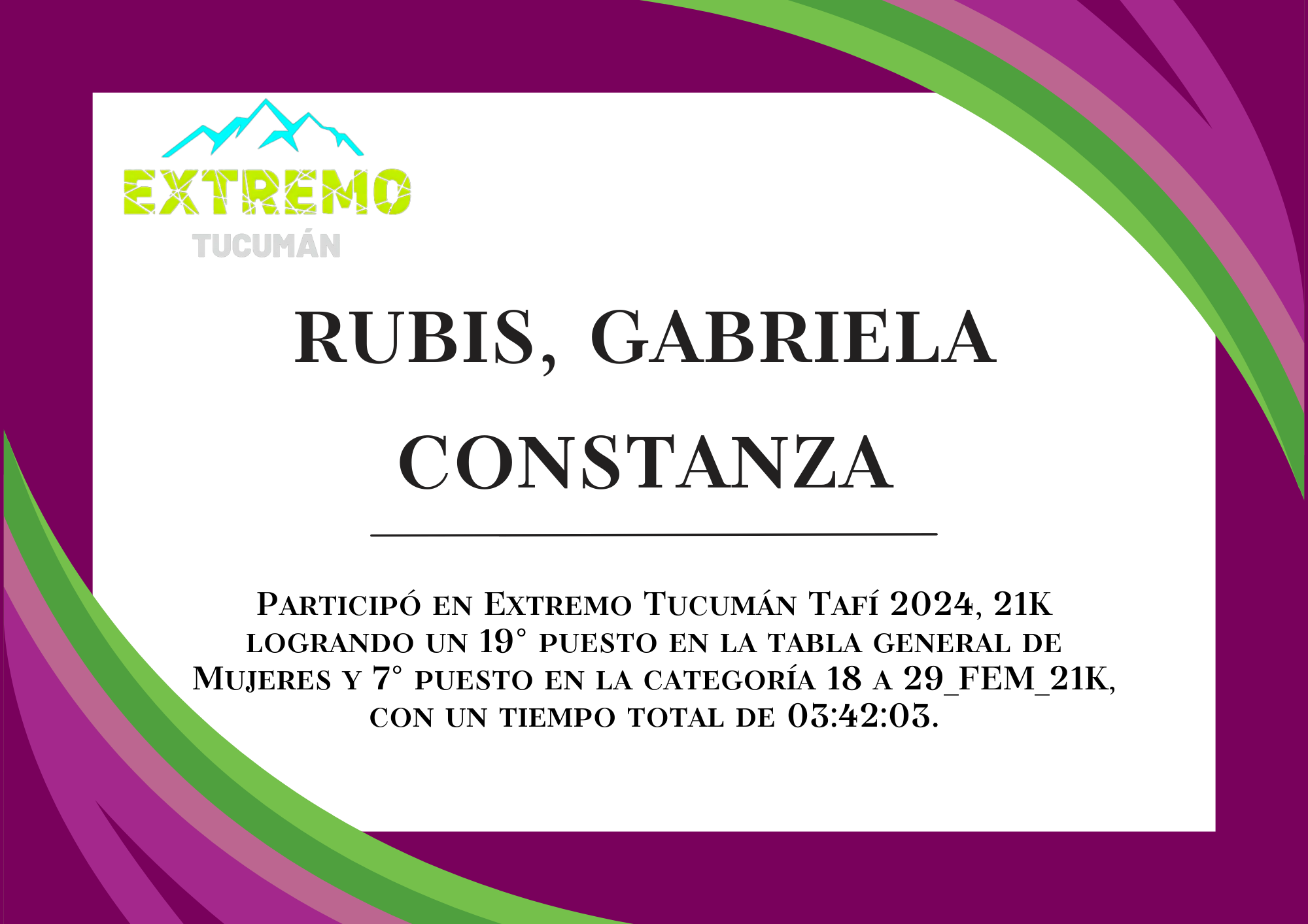 | 49 | 281 | Rubis, Gabriela Constanza | 21K | HASTA_29_AÑOS_FEM_21K | 03:42:03 | Descargar |