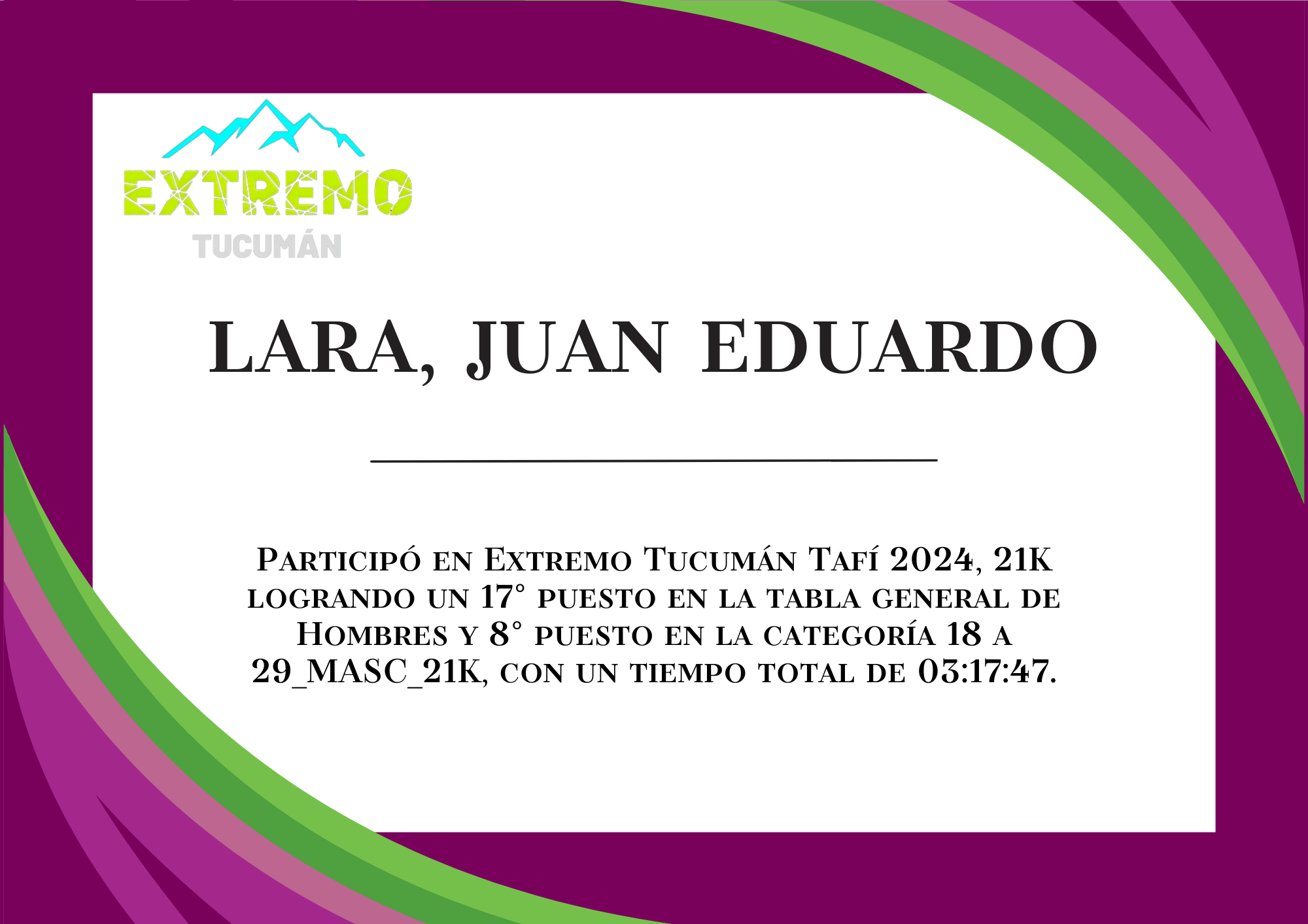 | 26 | 277 | Lara, Juan Eduardo | 21K | HASTA_29_AÑOS_MASC_21K | 03:17:47 | Descargar |