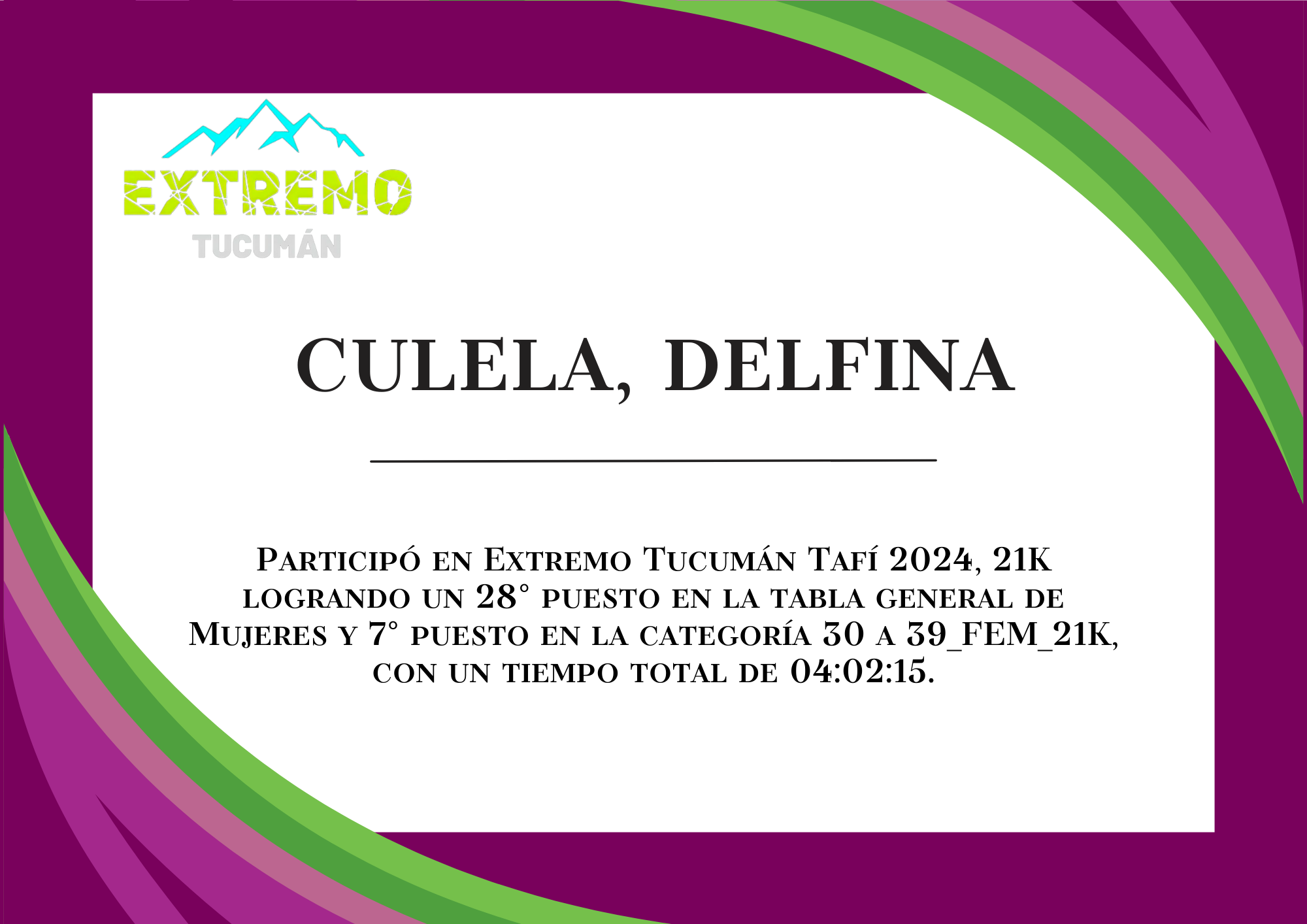 | 70 | 258 | Culela, Delfina | 21K | 30_A_39_AÑOS_FEM_21K | 04:02:15 | Descargar |