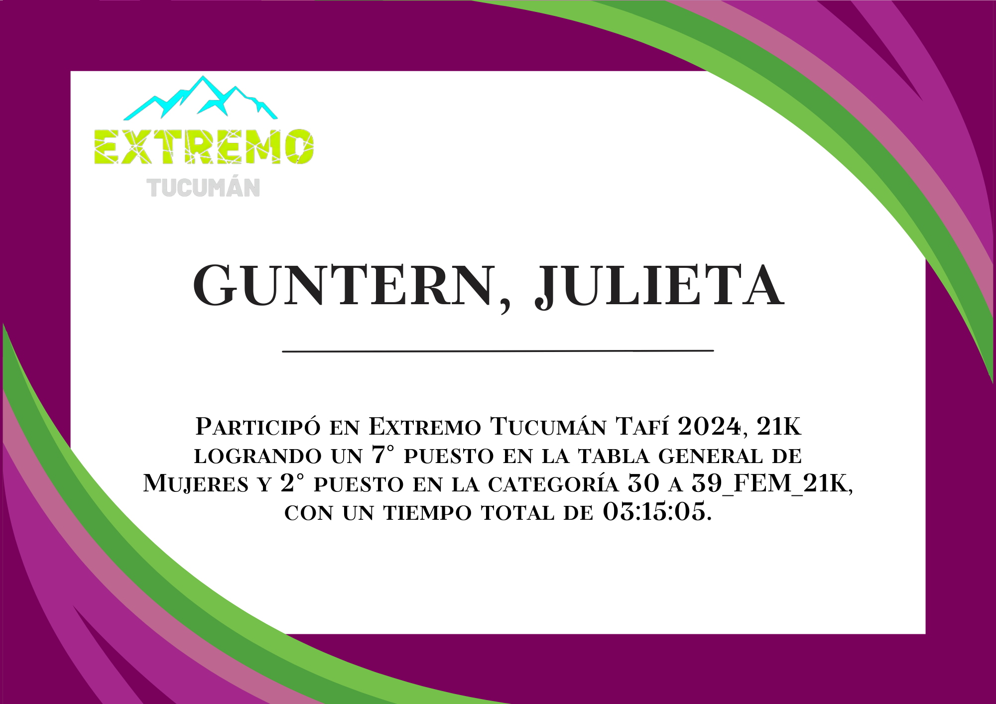 | 20 | 274 | Guntern, Julieta | 21K | 30_A_39_AÑOS_FEM_21K | 03:15:05 | Descargar |