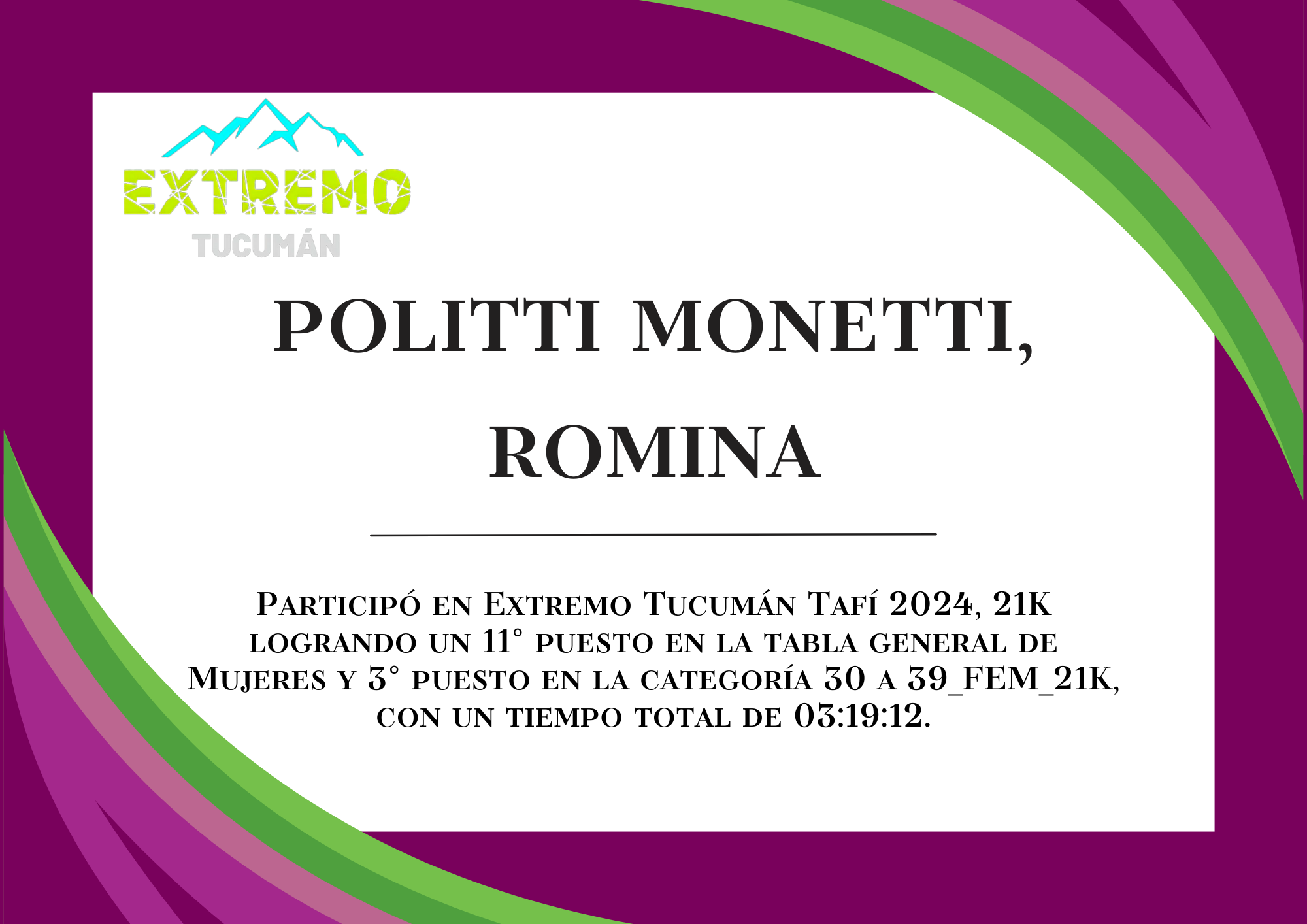 | 28 | 262 | Politti Monetti, Romina | 21K | 30_A_39_AÑOS_FEM_21K | 03:19:12 | Descargar |