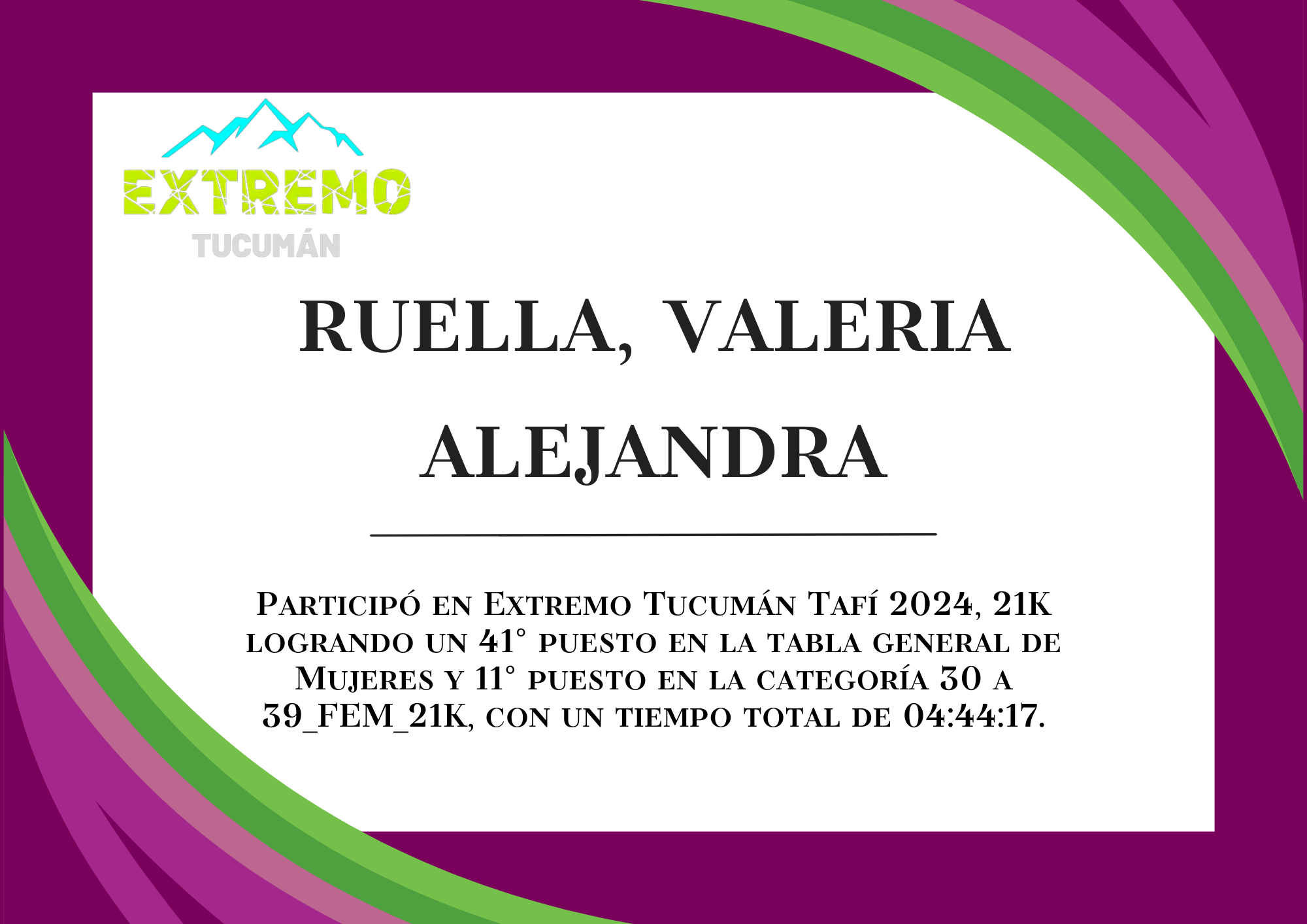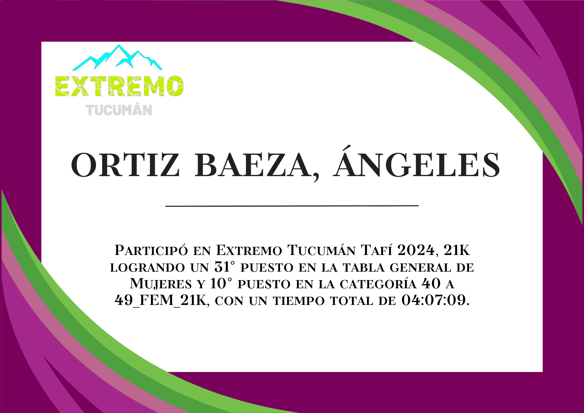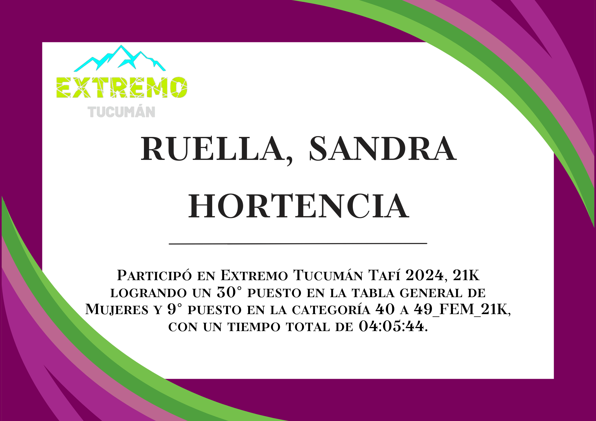| 72 | 252 | Ruella, Sandra Hortencia | 21K | 40_A_49_AÑOS_FEM_21K | 04:05:44 | Descargar |