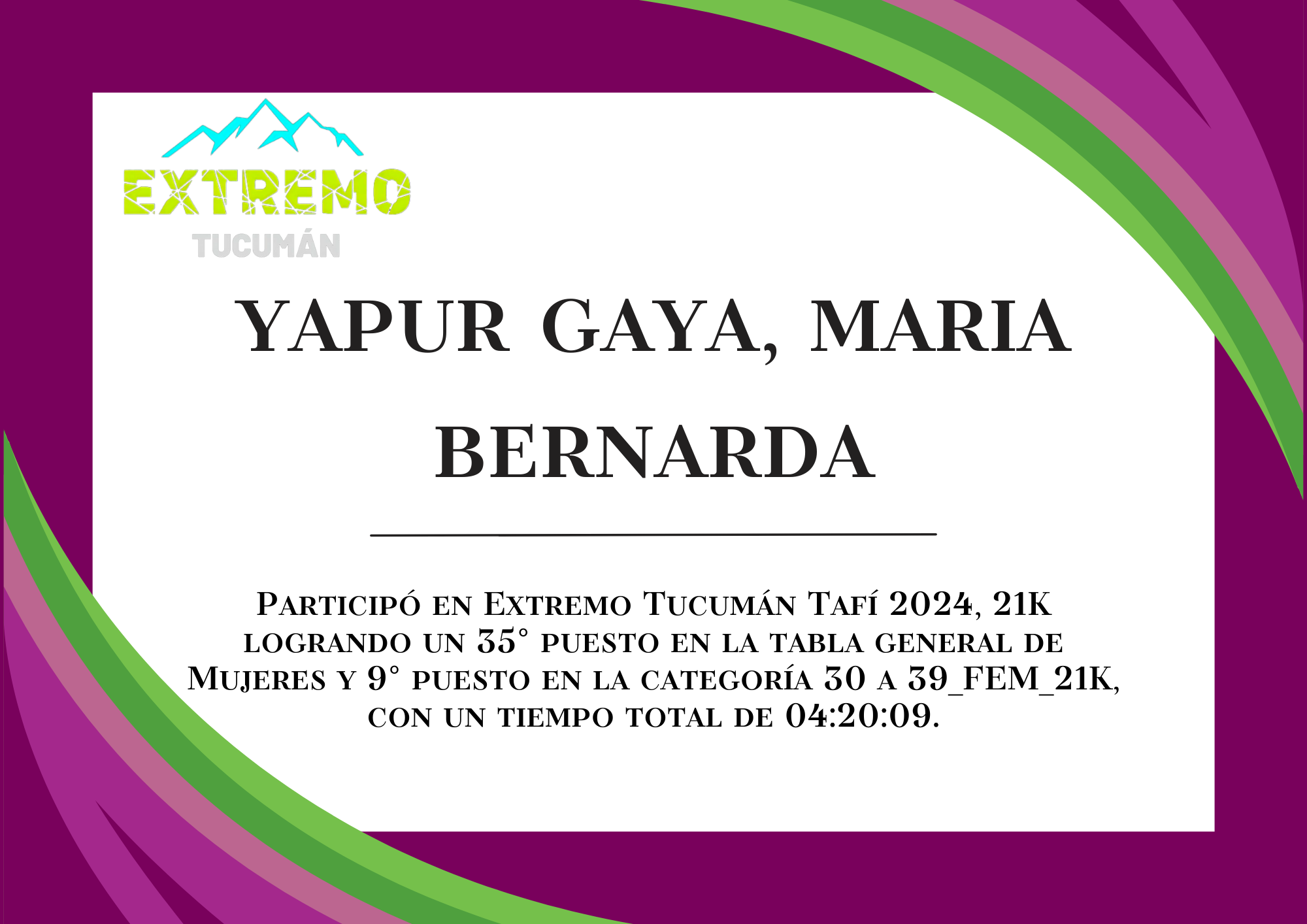 | 82 | 322 | Yapur Gaya, Maria Bernarda | 21K | 30_A_39_AÑOS_FEM_21K | 04:20:09 | Descargar |