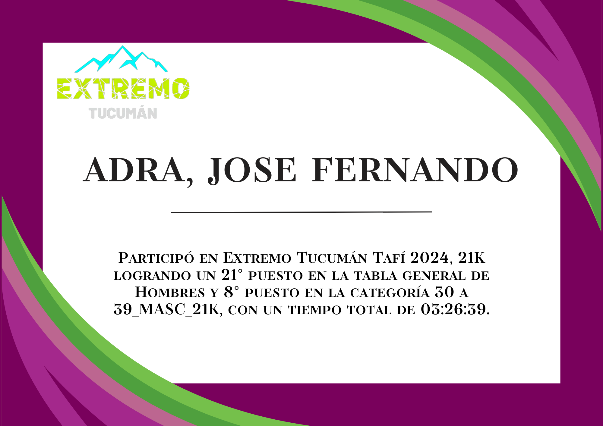| 32 | 237 | Adra, Jose Fernando | 21K | 30_A_39_AÑOS_MASC_21K | 03:26:39 | Descargar |