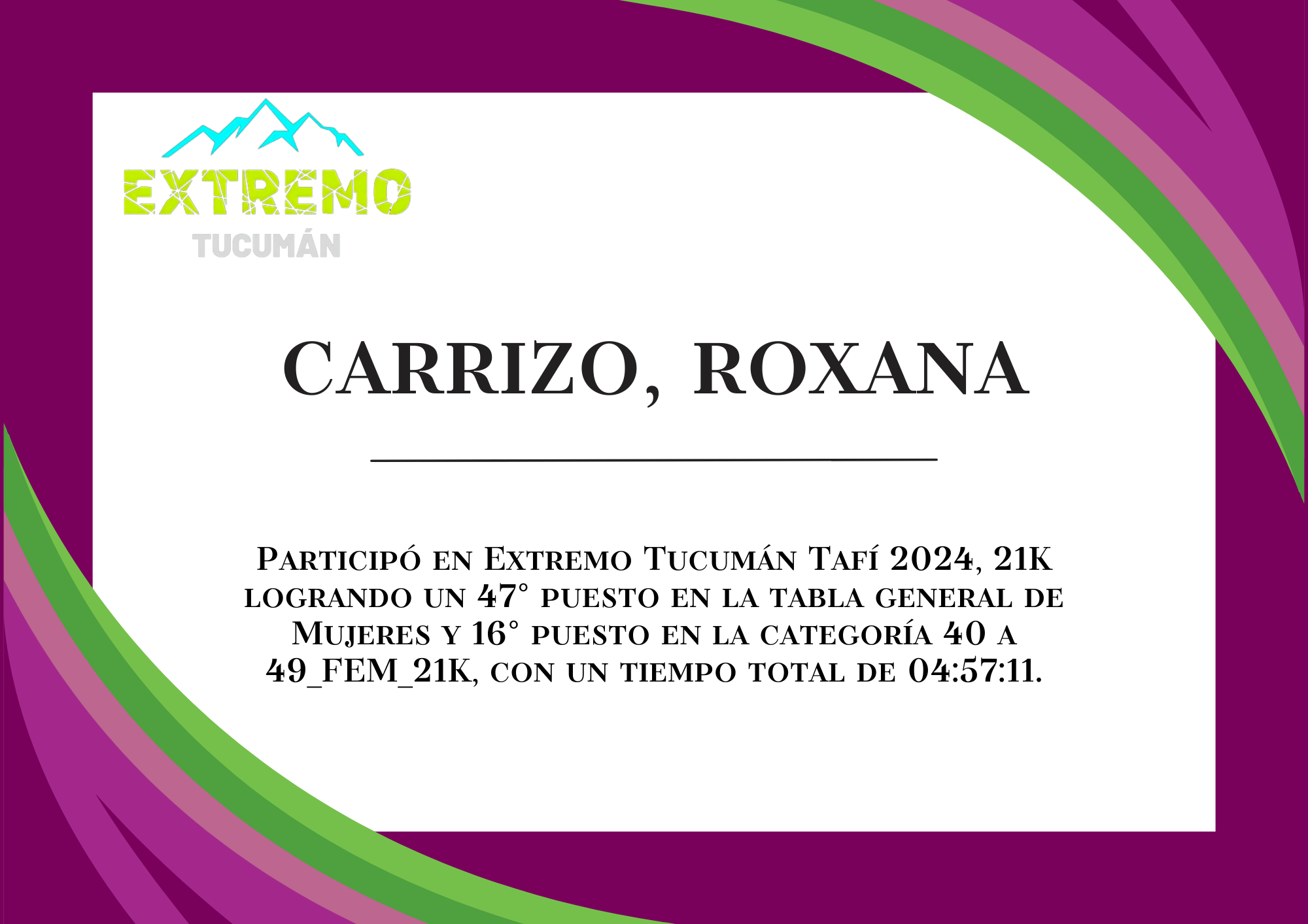 | 96 | 234 | Carrizo, Roxana | 21K | 40_A_49_AÑOS_FEM_21K | 04:57:11 | Descargar |