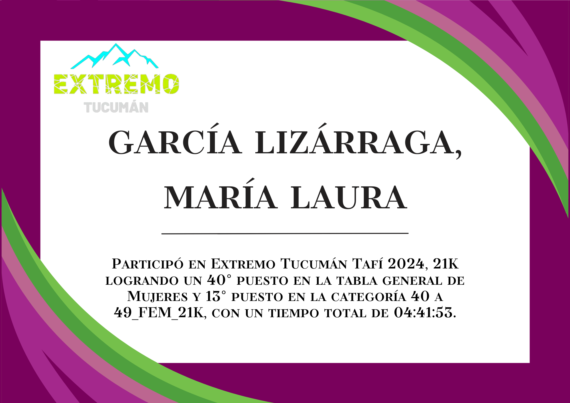 | 89 | 241 | García Lizárraga, María Laura | 21K | 40_A_49_AÑOS_FEM_21K | 04:41:53 | Descargar |
