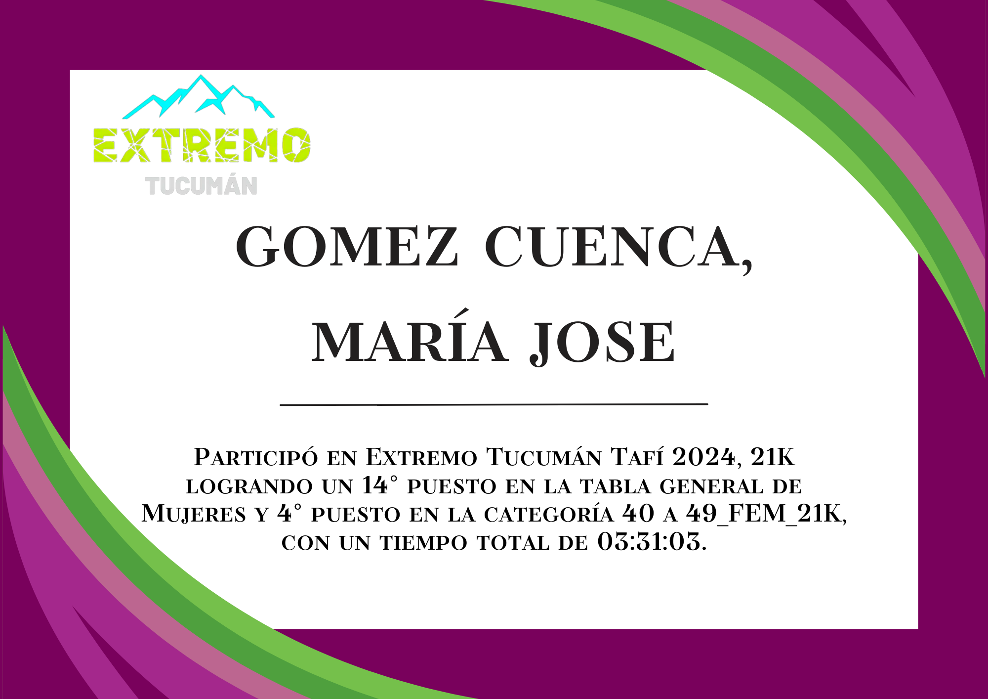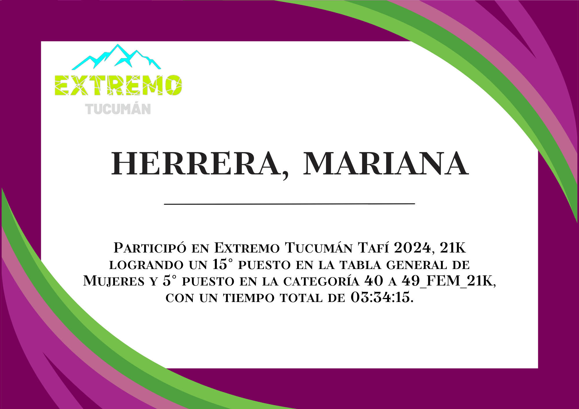 | 40 | 240 | Herrera, Mariana | 21K | 40_A_49_AÑOS_FEM_21K | 03:34:15 | Descargar |