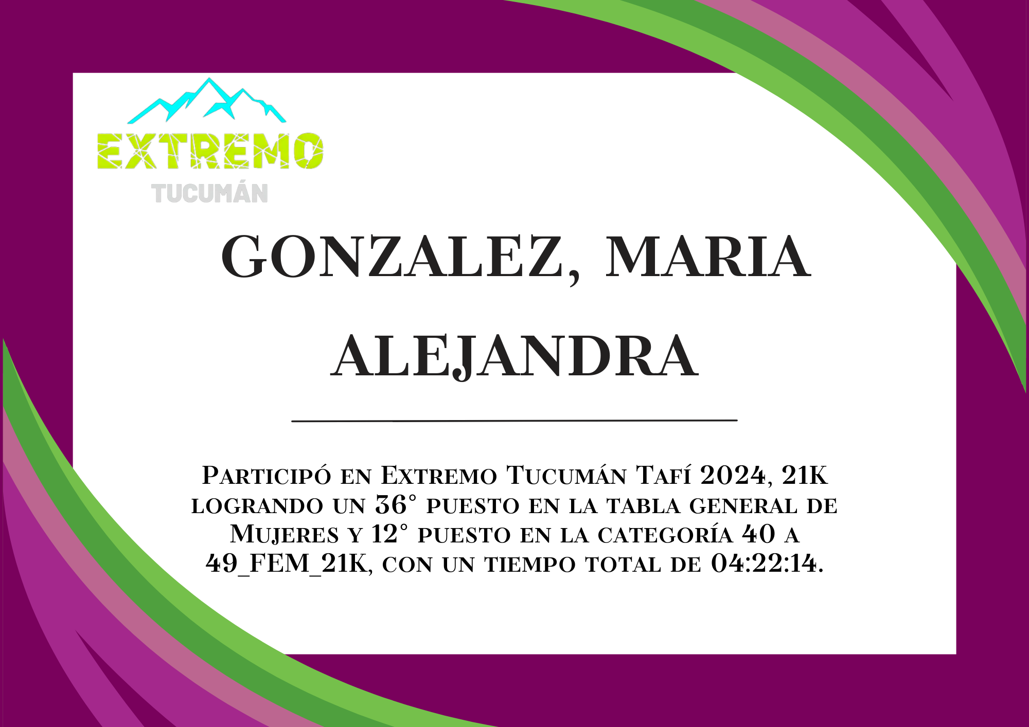 | 84 | 236 | Gonzalez, Maria Alejandra | 21K | 40_A_49_AÑOS_FEM_21K | 04:22:14 | Descargar |