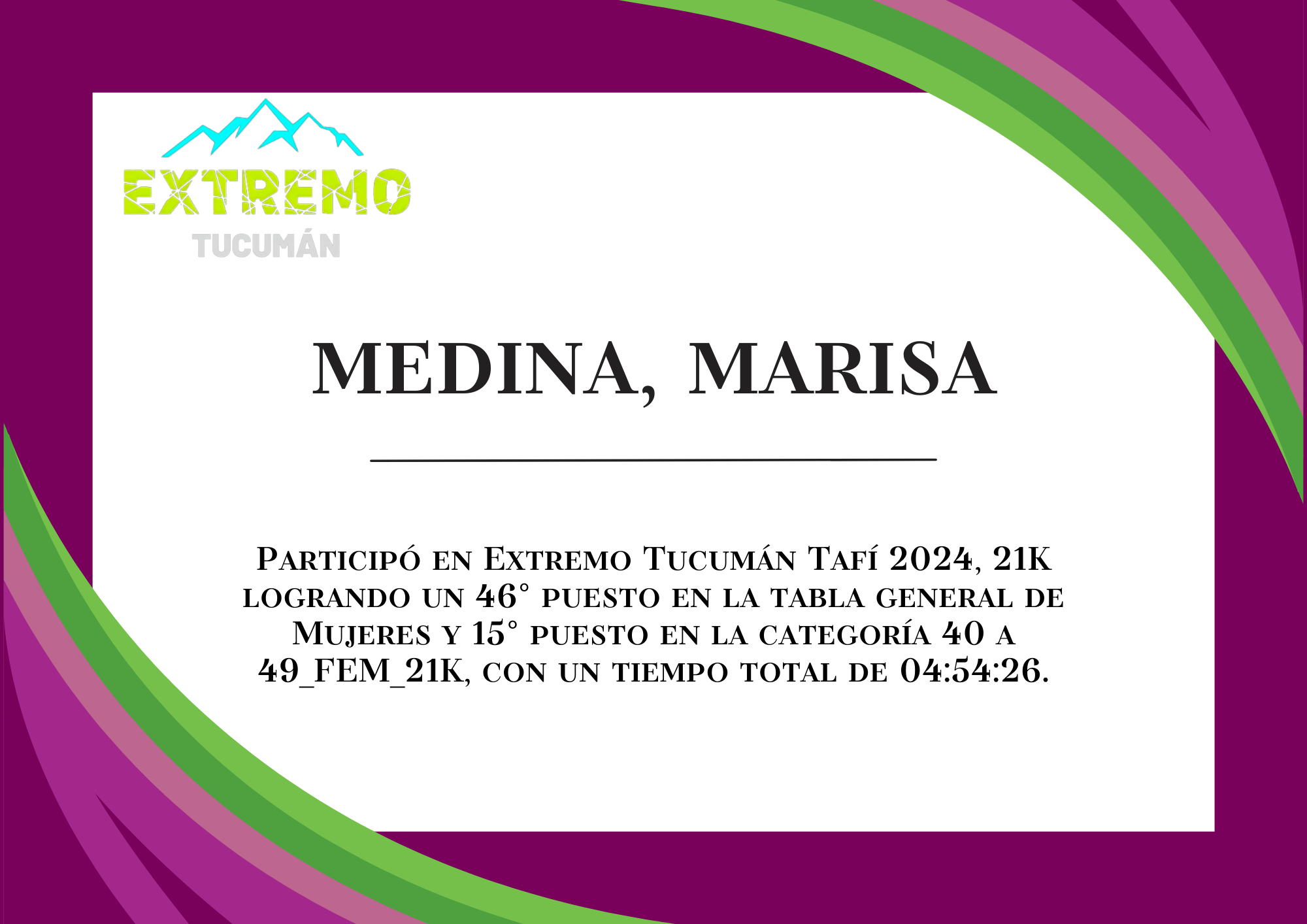 | 95 | 296 | Medina, Marisa | 21K | 40_A_49_AÑOS_FEM_21K | 04:54:26 | Descargar |
