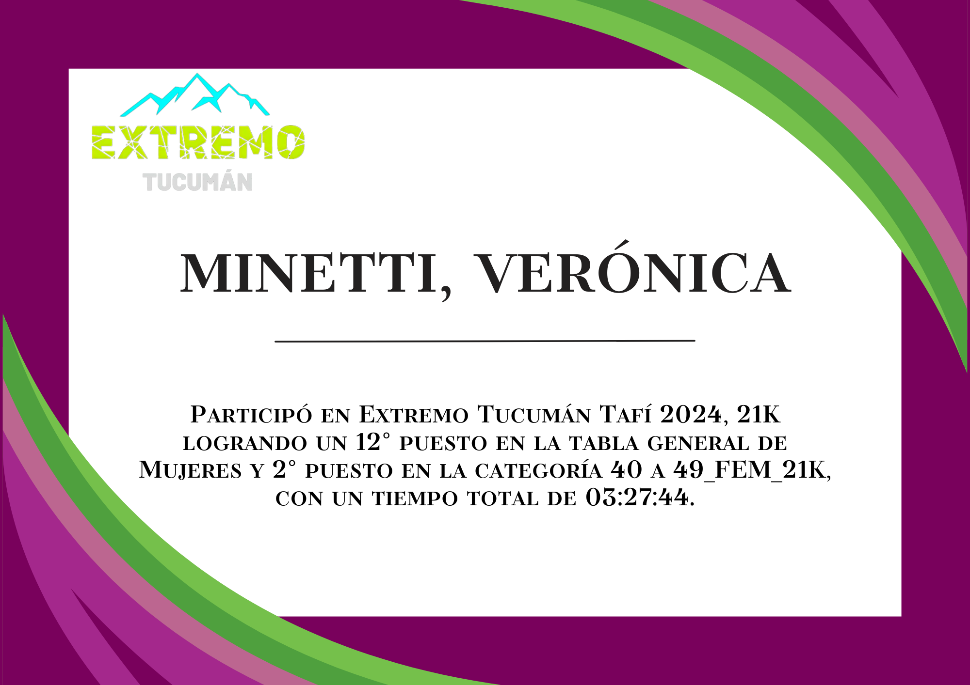 | 33 | 276 | Minetti, Verónica | 21K | 40_A_49_AÑOS_FEM_21K | 03:27:44 | Descargar |