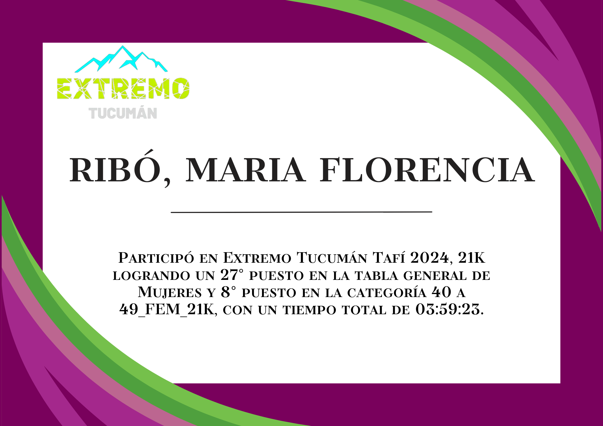 | 67 | 253 | Ribó, Maria Florencia | 21K | 40_A_49_AÑOS_FEM_21K | 03:59:23 | Descargar |