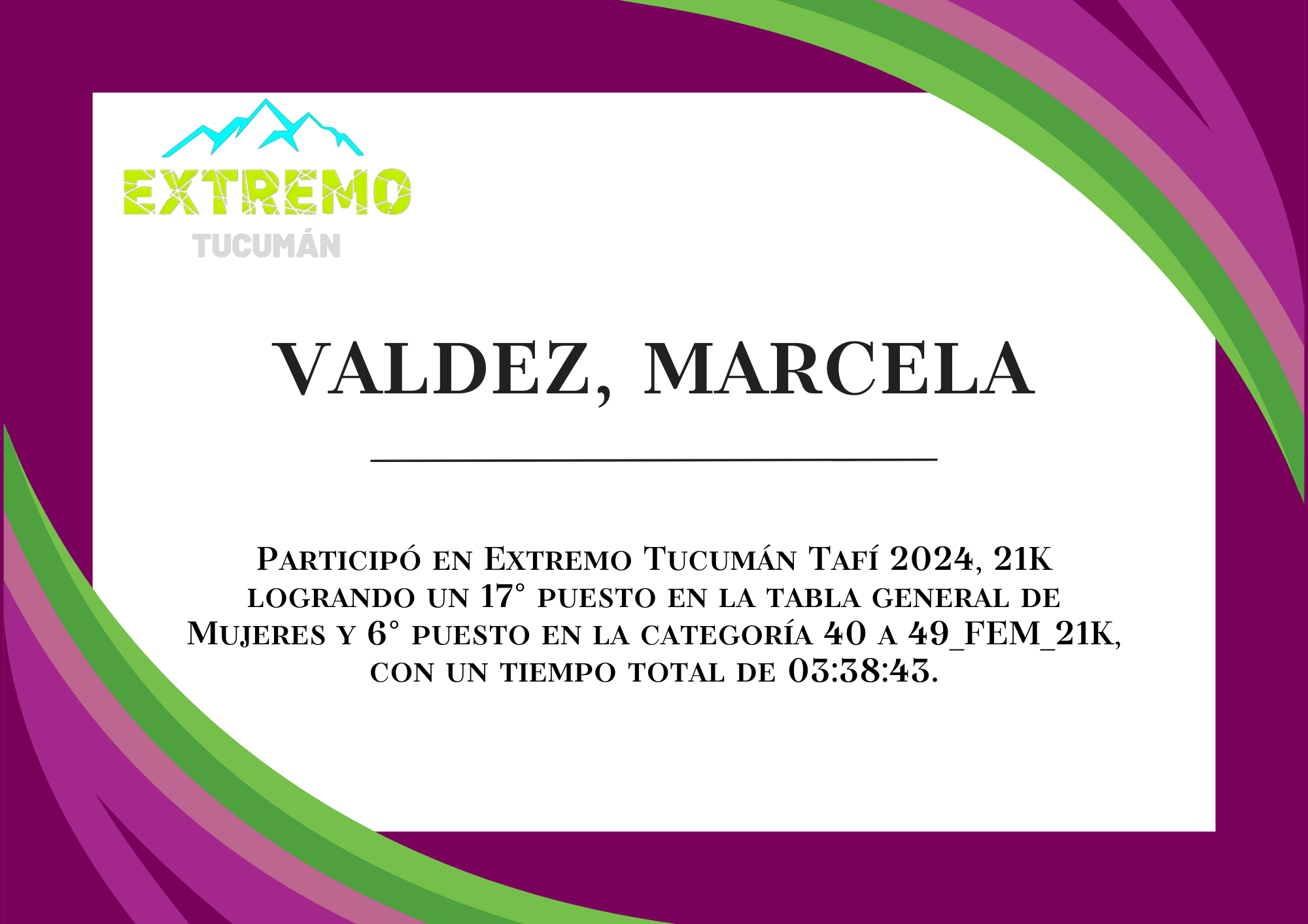 | 46 | 312 | Valdez, Marcela | 21K | 40_A_49_AÑOS_FEM_21K | 03:38:43 | Descargar |