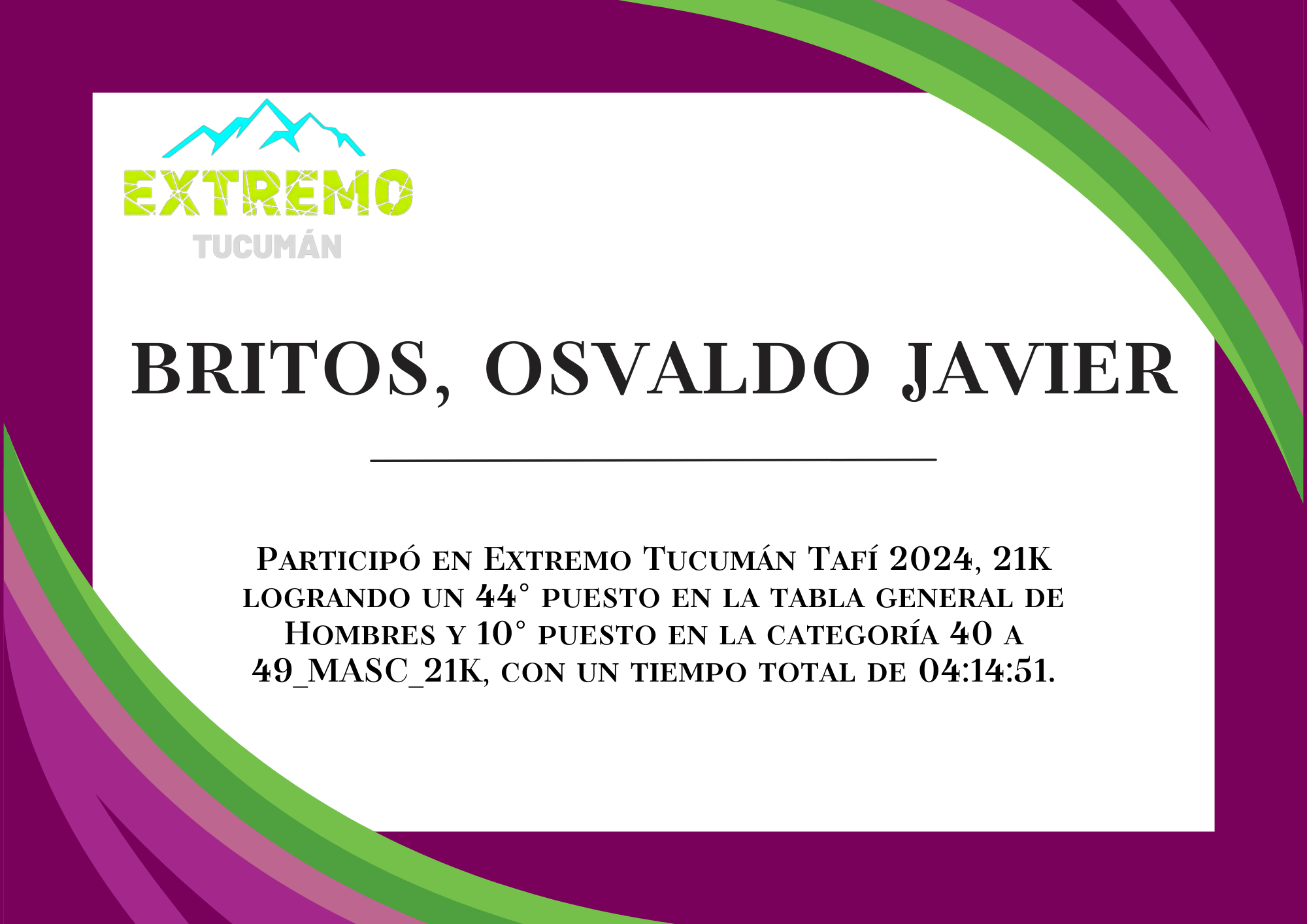 | 75 | 227 | Britos, Osvaldo Javier | 21K | 40_A_49_AÑOS_MASC_21K | 04:14:51 | Descargar |