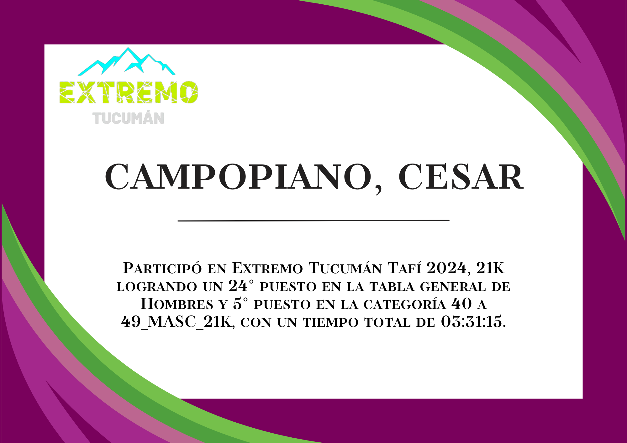| 38 | 222 | Campopiano, Cesar | 21K | 40_A_49_AÑOS_MASC_21K | 03:31:15 | Descargar |