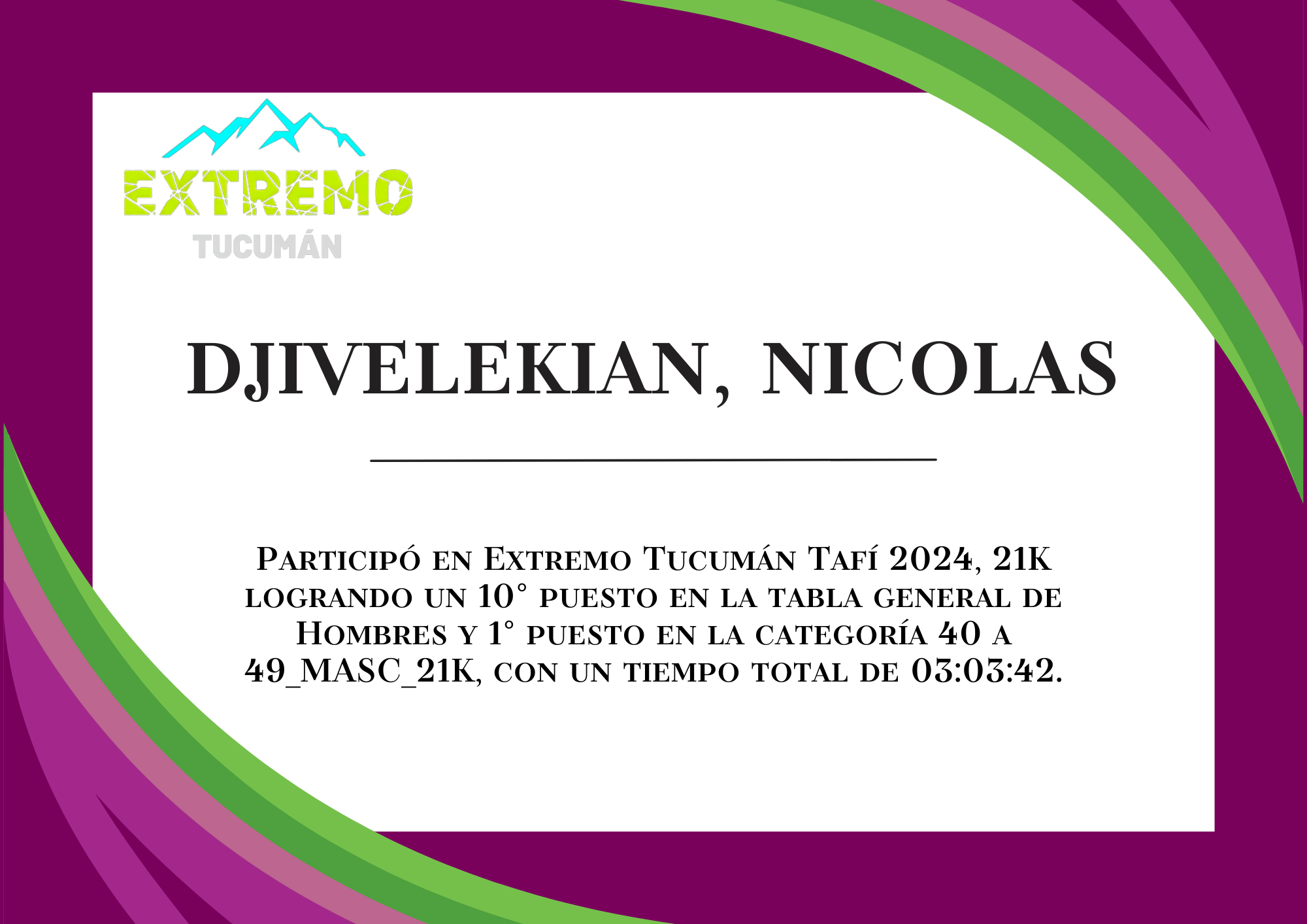 | 61 | 298 | Fernandez, Javier | 21K | 40_A_49_AÑOS_MASC_21K | 03:53:38 | Descargar |