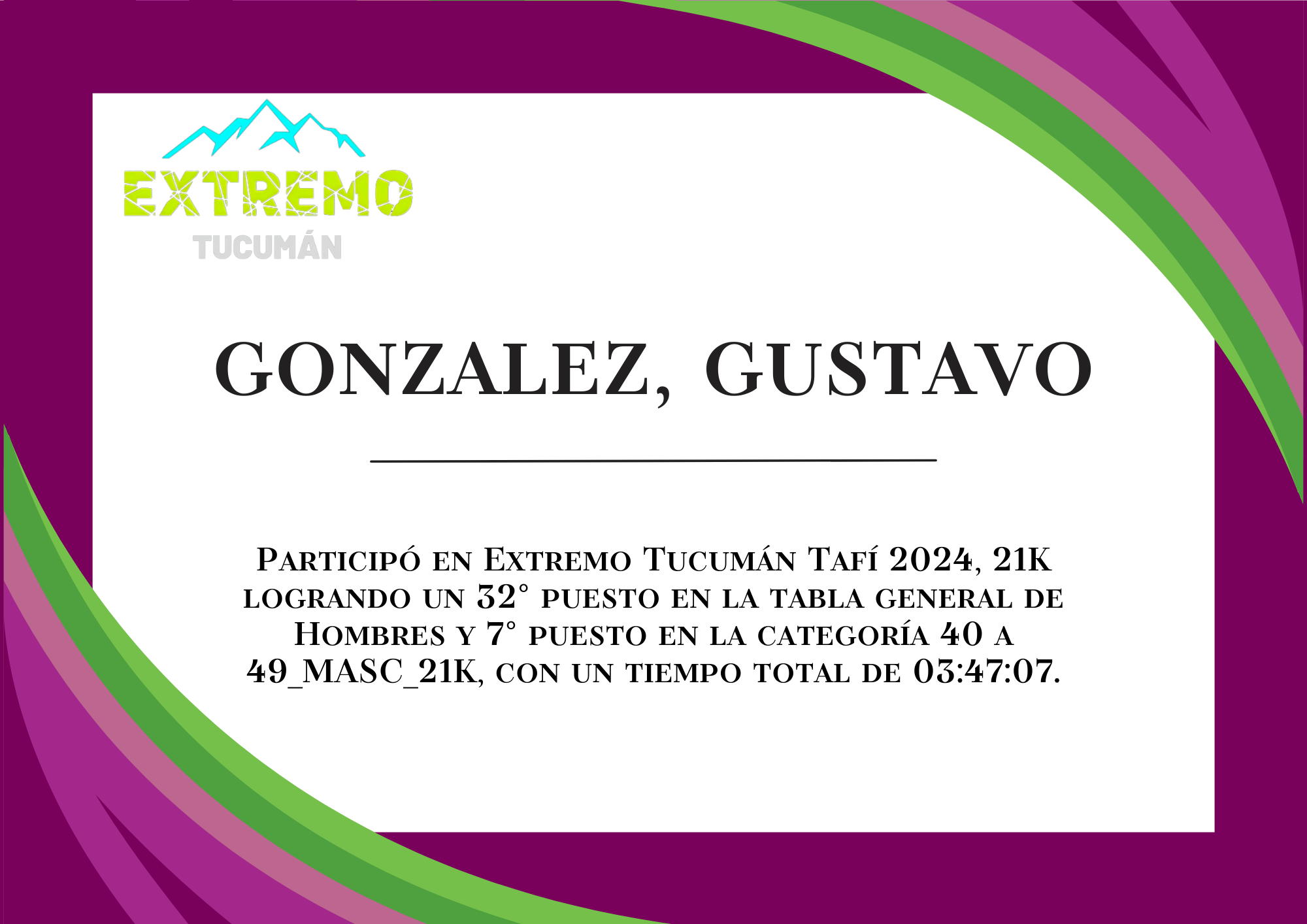 | 54 | 246 | Gonzalez, Gustavo | 21K | 40_A_49_AÑOS_MASC_21K | 03:47:07 | Descargar |