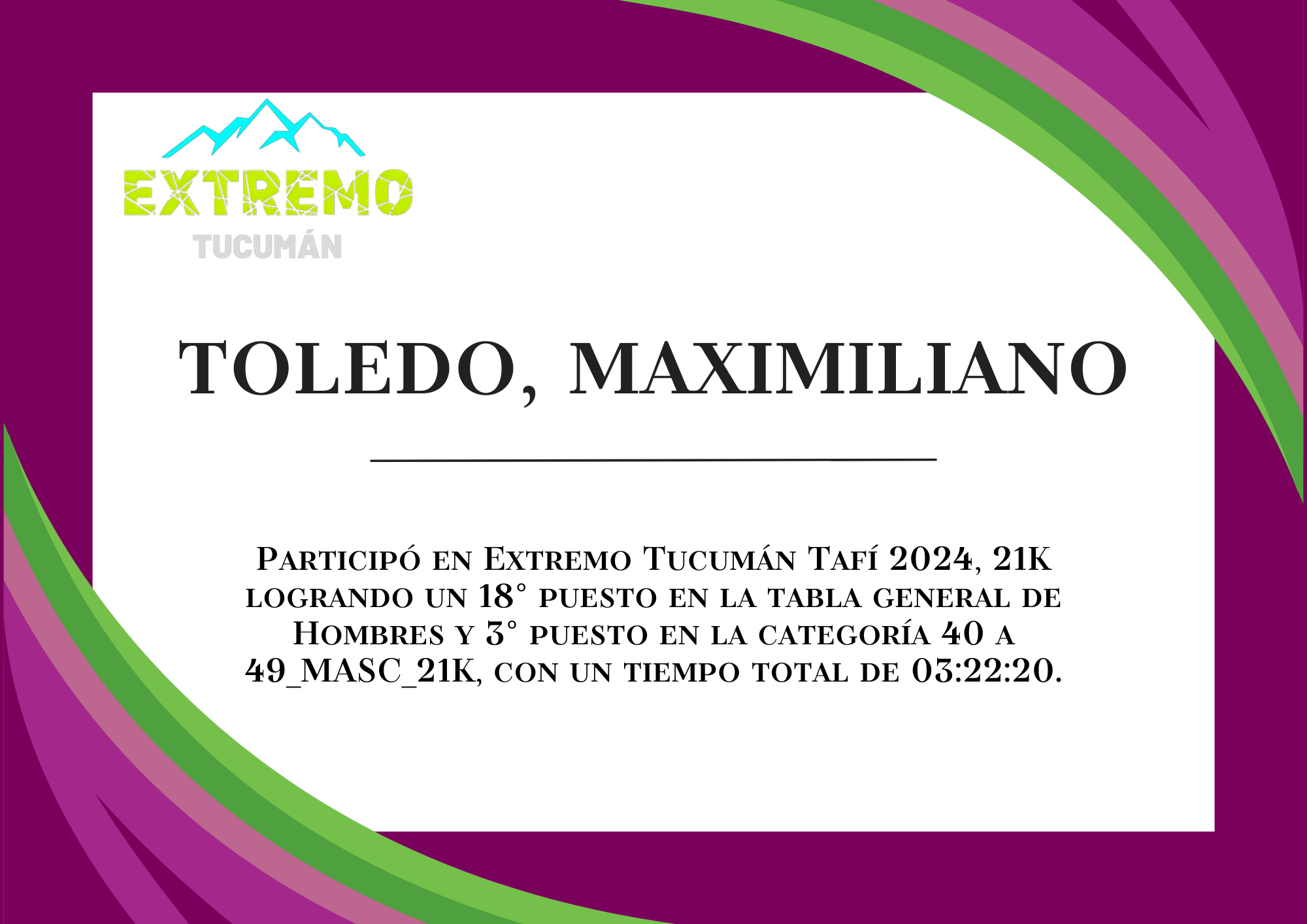 | 29 | 256 | Toledo, Maximiliano | 21K | 40_A_49_AÑOS_MASC_21K | 03:22:20 | Descargar |