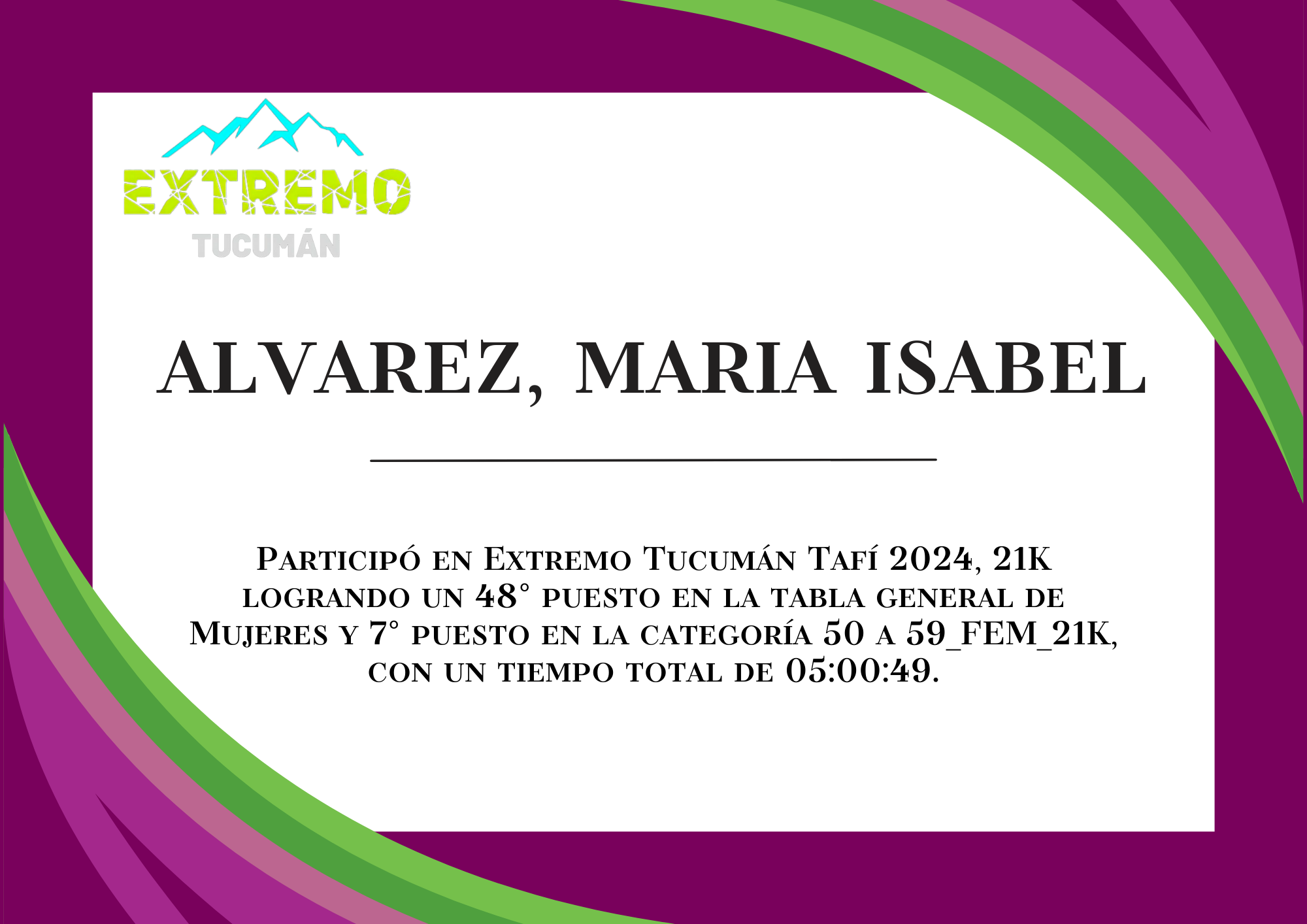 | 97 | 235 | Alvarez, Maria Isabel | 21K | 50_A_59_AÑOS_FEM_21K | 05:00:49 | Descargar |