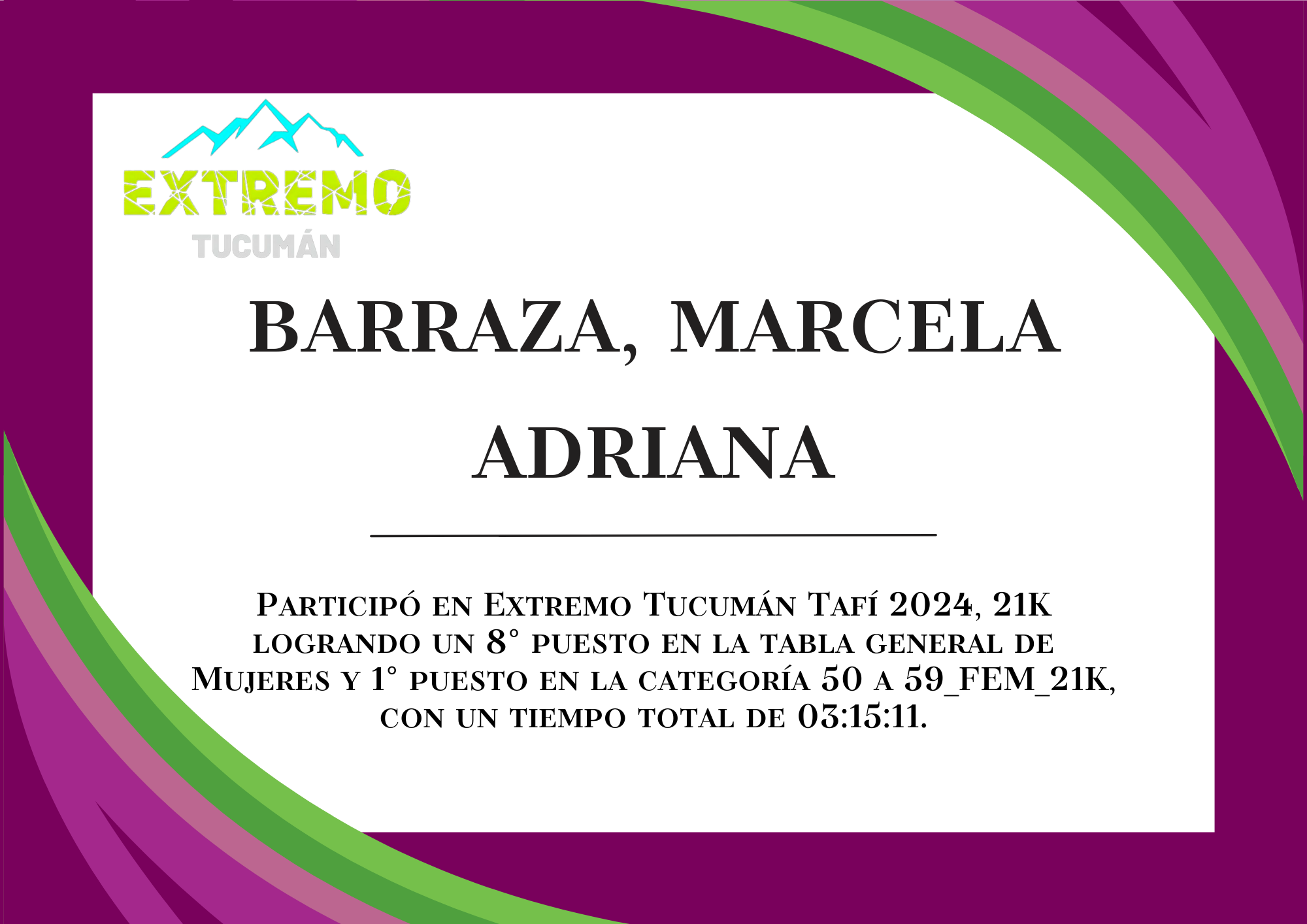 | 21 | 314 | Barraza, Marcela Adriana | 21K | 50_A_59_AÑOS_FEM_21K | 03:15:11 | Descargar |