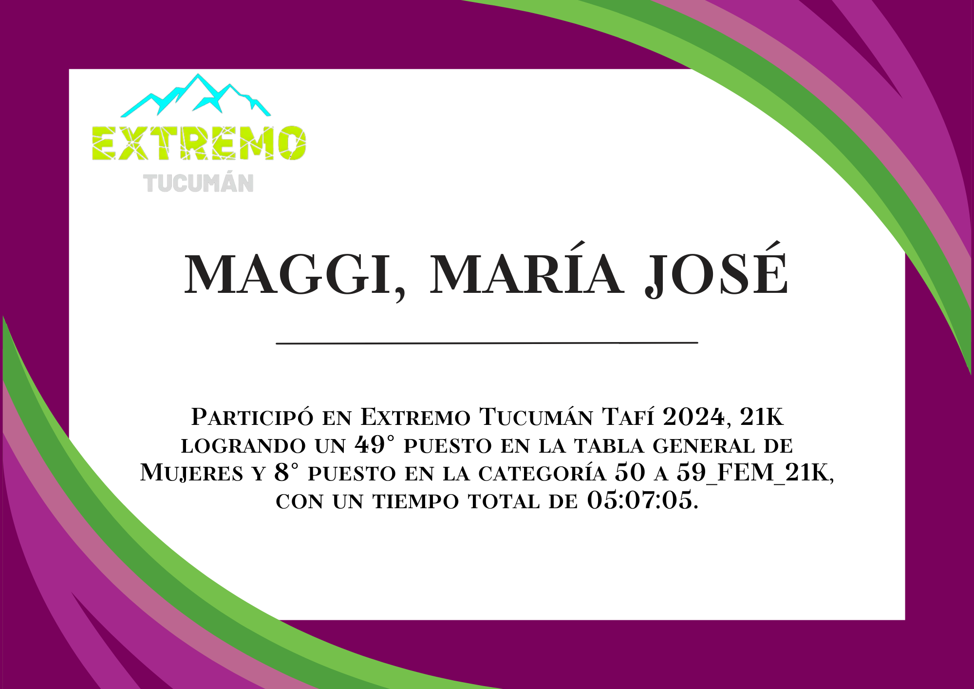 | 98 | 245 | Maggi, María José | 21K | 50_A_59_AÑOS_FEM_21K | 05:07:05 | Descargar |