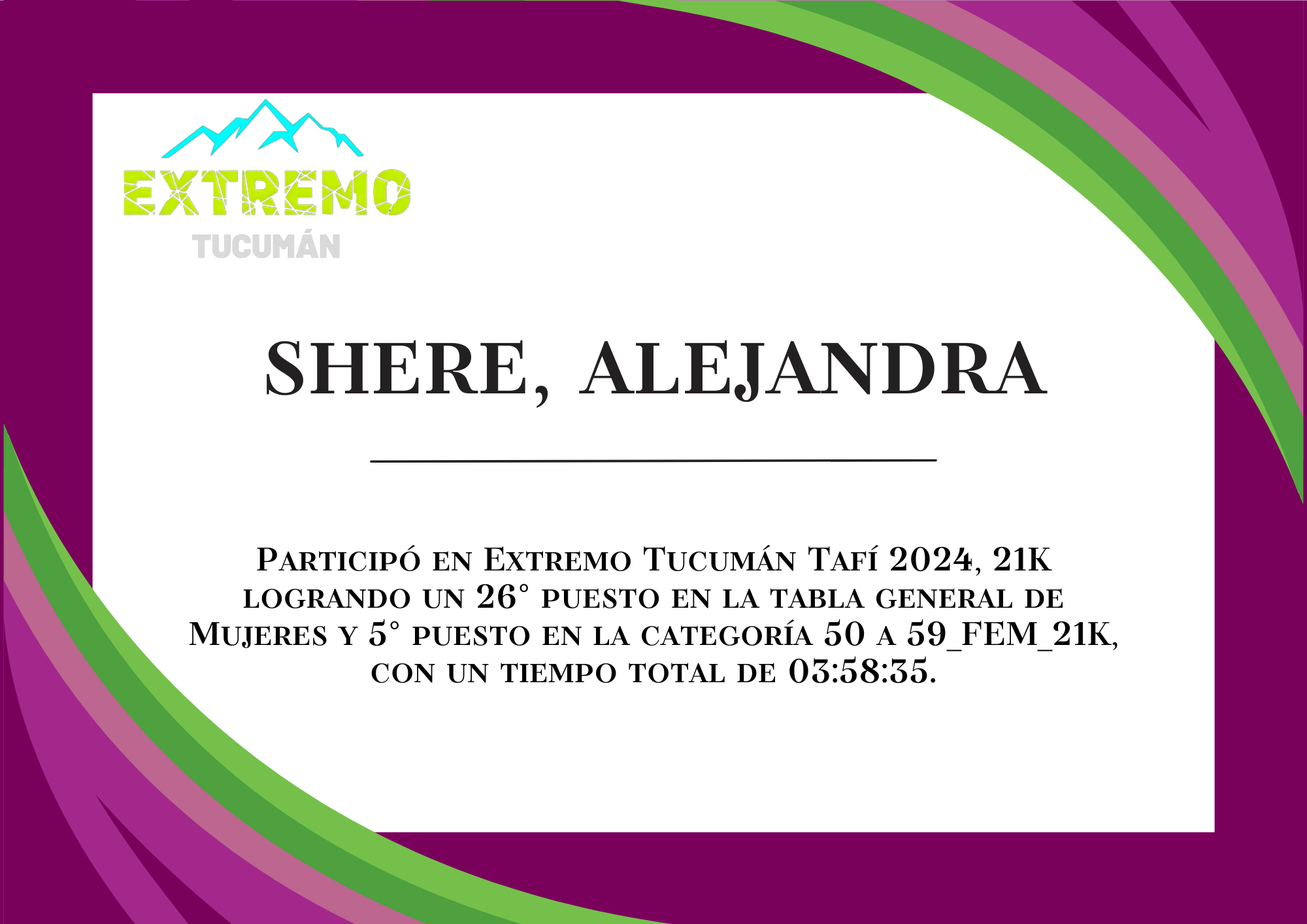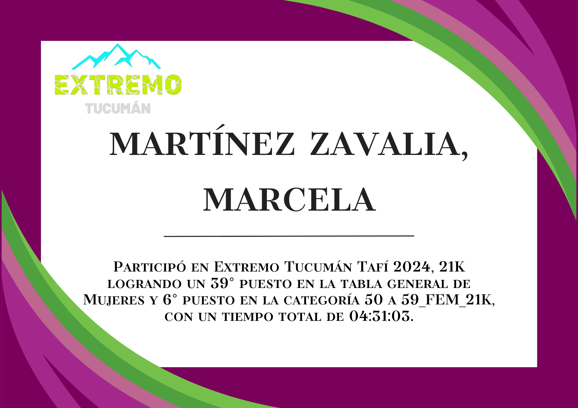 | 66 | 311 | Shere, Alejandra | 21K | 50_A_59_AÑOS_FEM_21K | 03:58:35 | Descargar |