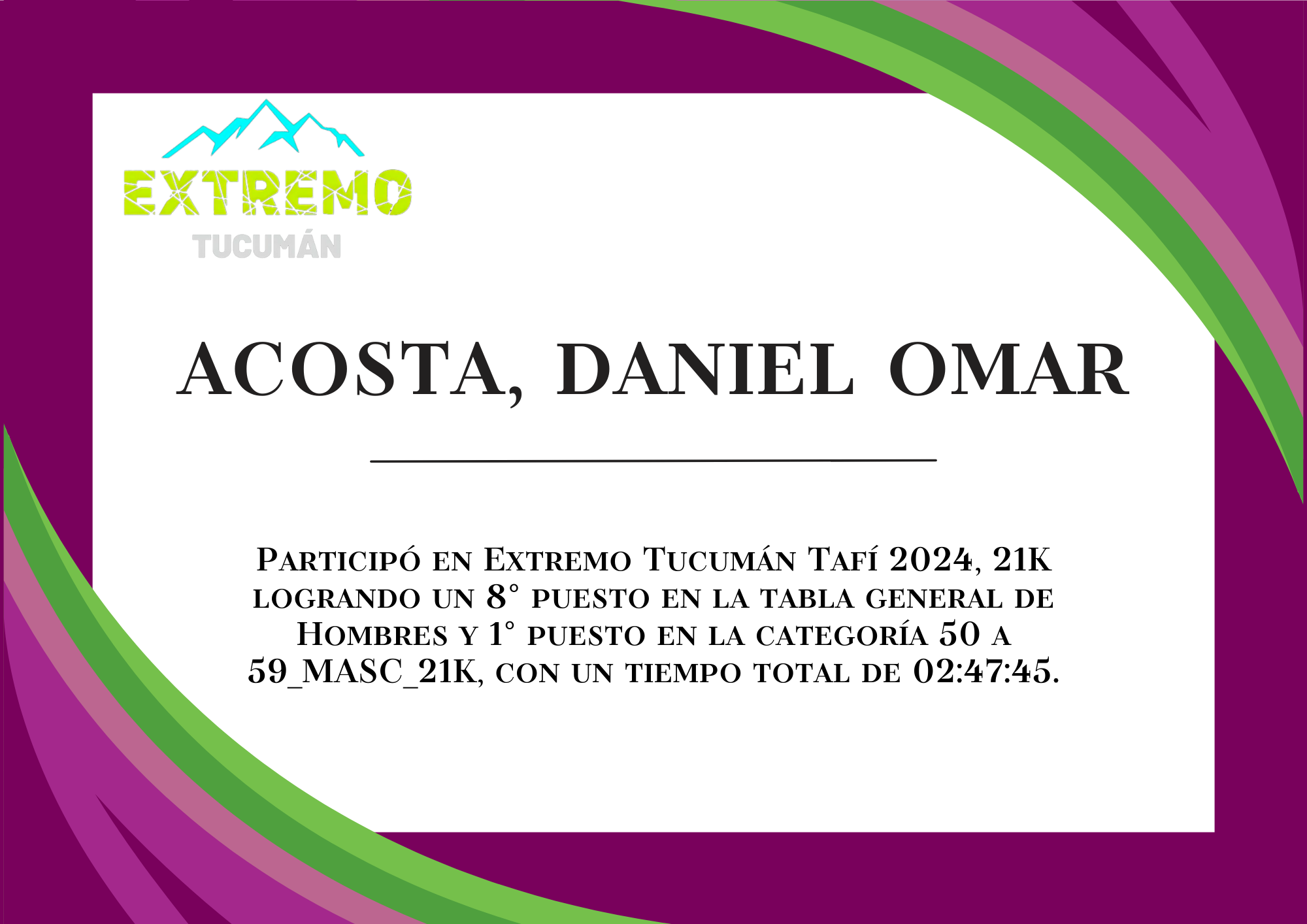 | 11 | 231 | Acosta, Daniel Omar | 21K | 50_A_59_AÑOS_MASC_21K | 02:47:45 | Descargar |