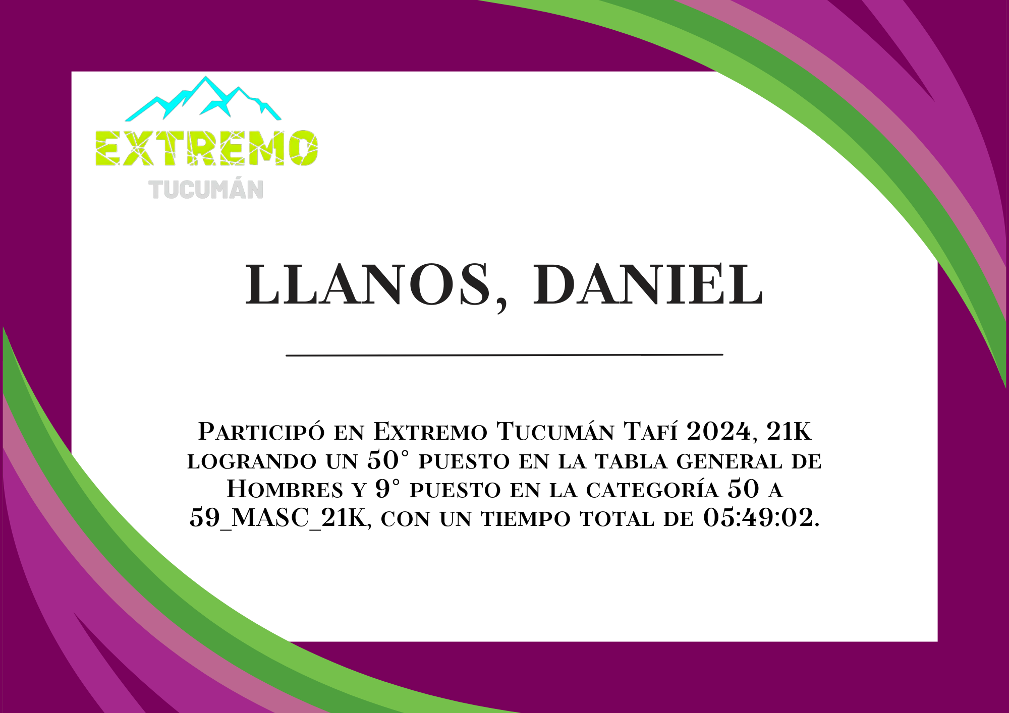 | 101 | 318 | Llanos, Daniel | 21K | 50_A_59_AÑOS_MASC_21K | 05:49:02 | Descargar |