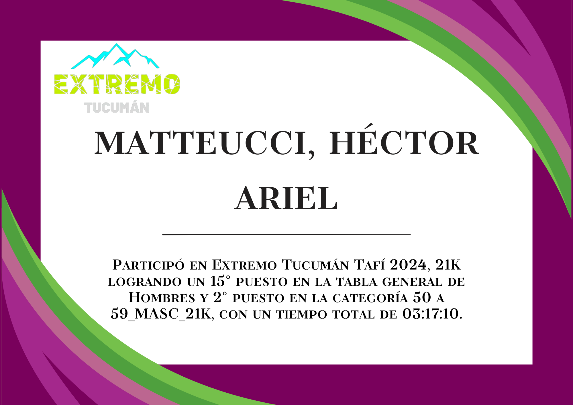 | 24 | 269 | Matteucci, Héctor Ariel | 21K | 50_A_59_AÑOS_MASC_21K | 03:17:10 | Descargar |