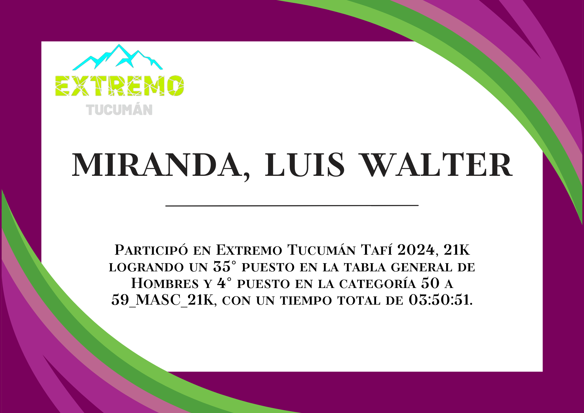 | 57 | 297 | Miranda, Luis Walter | 21K | 50_A_59_AÑOS_MASC_21K | 03:50:51 | Descargar |